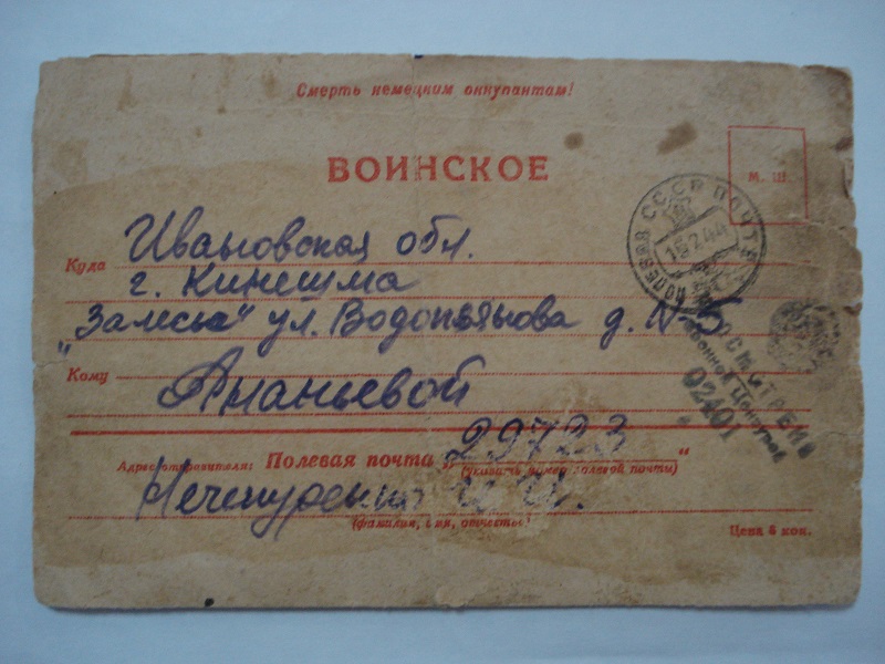 «…Сообщаю, что жив и здоров, чего и Вам желаю. Основные новости Вы конечно знаете из газет. Это о действиях второго фронта. Начинаем гнать фрицев. Немцы, отступая, все сжигают.