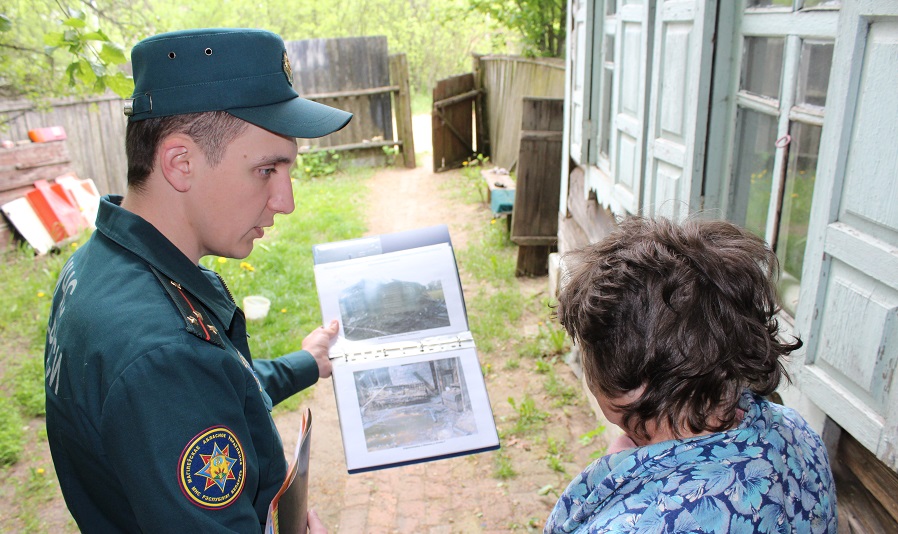 А. Сафронов, инспектор группы пропаганды и взаимодействия с общественностью БГРО ЧС, показывает жительнице д. Маяк фотографии с мест пожаров