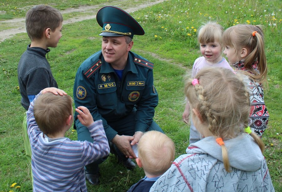 Д. Сказов, ст. инспектор ГПиВО БГРО ЧС, в аг. Горбацевичи беседует с малышами о безопасности