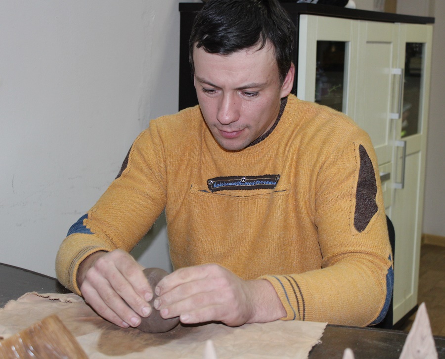 Утром — занятия по гребле, после полудня — шашечный турнир. Назавтра — работа с глиной и деревом, дартс, нарды, кегли. Дома — помощь по хозяйству родителям, с которыми проживает в Сычково. Каждый день этого молодого человека расписан по минутам. Только, к сожалению, непременными составляющими этого расписания являются регулярные обследования, наблюдения, лечение, оперативные вмешательства, реабилитация. И неизменный атрибут поддержки, который всегда при нем, — костыли. 31-летний Максим Пыж, инвалид 2-й группы. При этом он — единственный в районе из этой категории жителей Бобруйщины — ремесленник.
