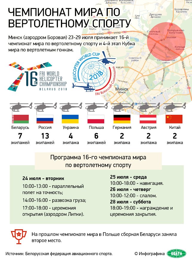 Основные соревнования пройдут на аэродроме Боровая. Согласно программе чемпионата состязания начнутся в 10.00 с упражнения «Параллельный полет на точность», затем состоится «Параллельная развозка грузов». В целом участники будут соревноваться в выполнении четырех упражнений: «Навигация», «Параллельный полет на точность», «Параллельная развозка грузов» и «Параллельный слалом». Национальные команды выступают на двух типах вертолетов Ми-2 и Робинсон-44.