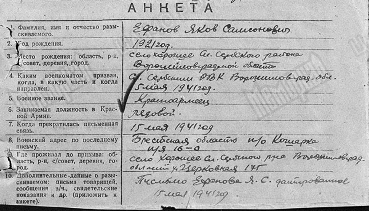 Среди них Яков Самсонович Ефанов, 1921 года рождения, уроженец села Хорошее Славяно-сербского района Ворошиловградской (ныне Луганской) области, призванный Славяно-сербским РВК Украинской ССР 5 мая 1941 года.