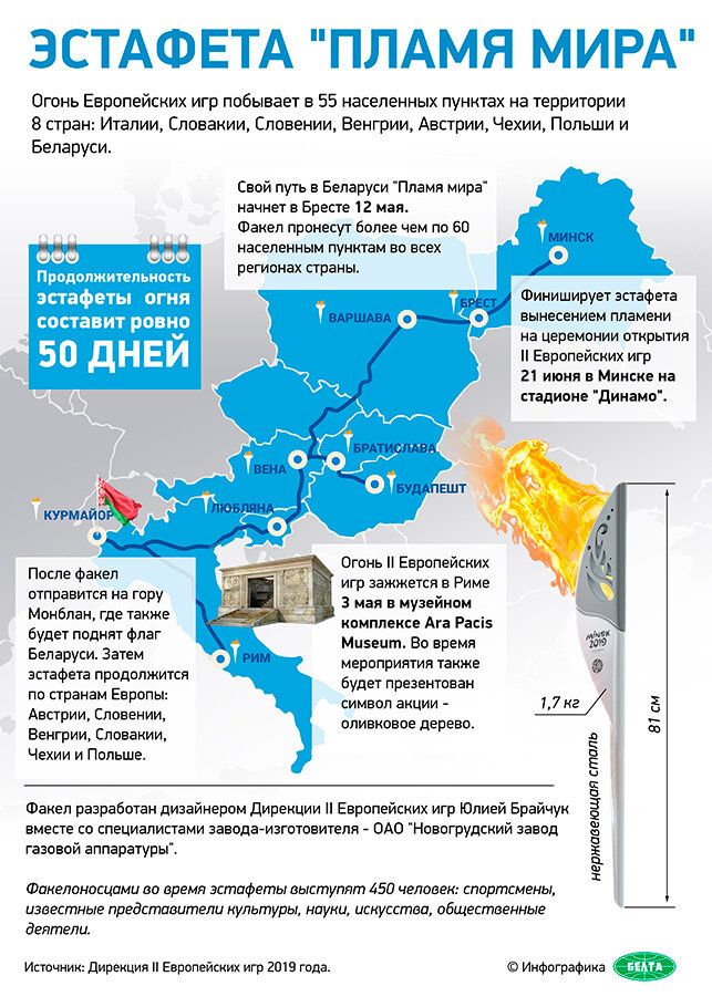 В Беларуси эстафета начнет свой путь 12 мая, факел мультиспортивного форума побывает во всех регионах: в Брестском — 12-17 мая, Гродненском — 18-23 мая, Витебском — 24-29 мая, Могилевском — 30 мая — 4 июня, Гомельском — 5-10 июня, Минском — 11-16 июня.