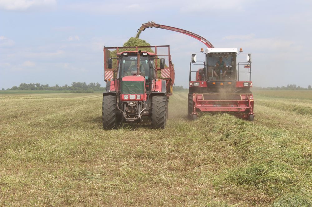 На падборцы і здрабненні травы заняты Аркадзь Аляксандравіч Алісеенка і Леанід Пятровіч Шкрадзюк на “Джон-Дзіры”. Дапамогу аказвае Іван Уладзіміравіч Макееў на КВК-800 з ААТ “Аграмашсервіс” (пра яго неаднойчы пісалі). Перавозку зялёнай масы ажыццяўляюць шэсць адзінак тэхнікі: МАЗы і трактары з прычэпамі. Два трактары задзейнічаны на трамбоўцы траншэі — Аляксандр Спірыдонавіч Кушавараў на “Амкадоры-342” і Сяргей Васільевіч Чараухін на МТЗ-3022.