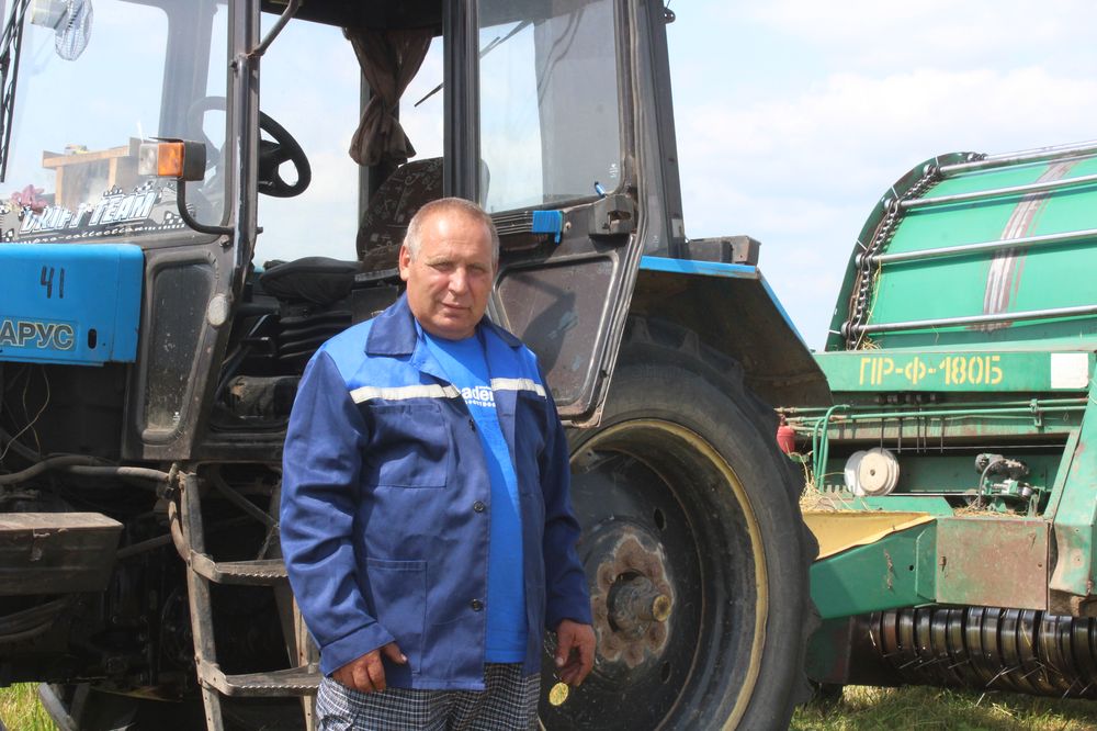 Пётр Ягоравіч Максімаў нарыхтоўвае сена трактарам МТЗ-1025 з прычапным прэсам ПРФ-180. Зрэшты, бабруйскай вытворчасці