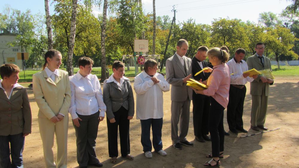 На центральной спортивной площадке построились учащиеся — молодые люди в возрасте от 18 лет и старше. Директор дома-интерната Г.Н. Савченко обратилась к присутствующим с приветственным словом. Как отметила Галина Николаевна, для учебы у парней и девушек есть все необходимое — уютный дом и люди, которые готовы оказать им поддержку. Чтобы учебный процесс проходил интереснее, директор вручила каждому ученику в подарок папку с нужными для занятий принадлежностями. Радость этого светлого события с проживающими дома-интерната разделили представители Совета ветеранов во главе с его председателем Е.В. Довнар. Евгения Владимировна пожелала учащимся здоровья, успехов и преподнесла им набор канцтоваров.