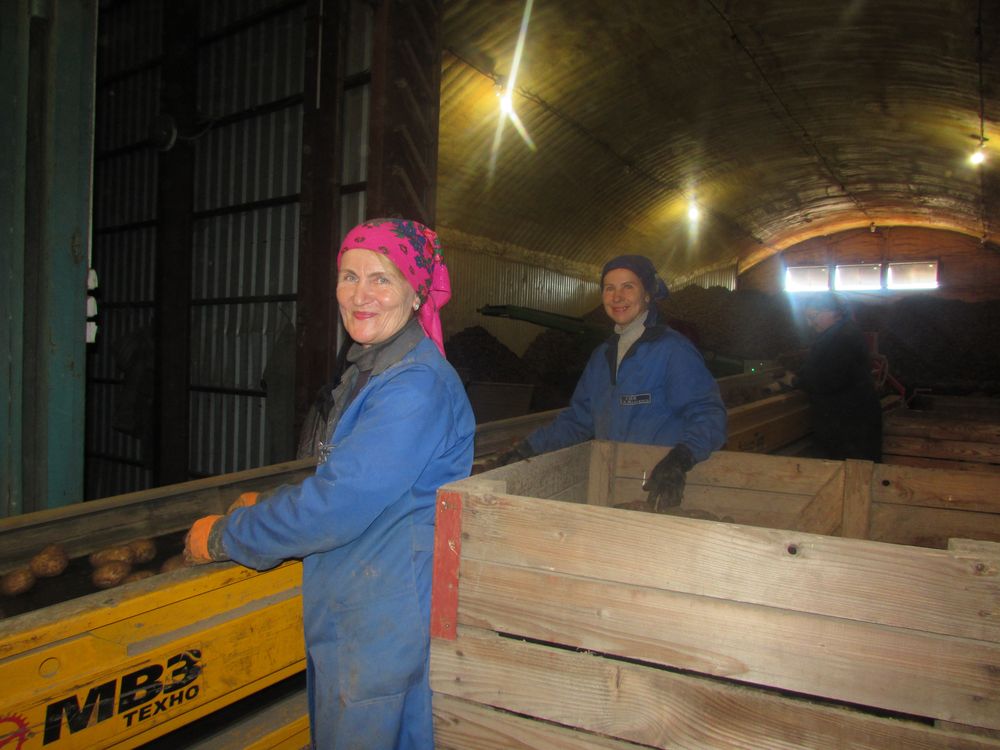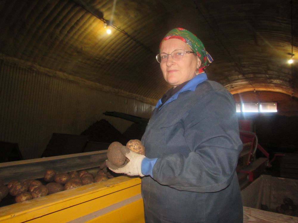 Сабраныя клубні праходзяць праз сартаванне. Харчовая бульба затарваецца ў сеткі для рэалізацыі.