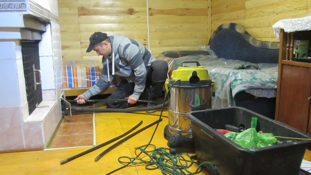 В распоряжении Александра и его напарника — большая лестница, комплект гибких штанг, массивная гиря с жесткой щеткой и веревкой, ершики разных диаметров, разборная гибкая штанга, позволяющая проходить все изгибы трубы без лазания на крышу и делать работу снизу, а также мощный промышленный пылесос, исключающий сильное загрязнение в помещении. Все это в короткие сроки и без лишнего дискомфорта для хозяев позволяет довести дымоход до надлежащего состояния. Демонстрируя процесс работы, Александр попутно рассказывал нам о некоторых особенностях своего дела: