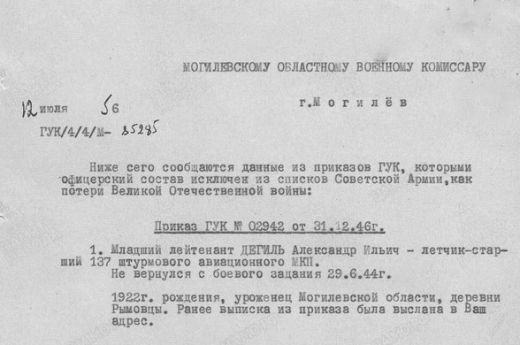 В Центральном архиве Министерства обороны Российской Федерации (г. Подольск) сохранился приказ Главного управления кадров Министерства обороны Союза СССР №02942 от 31 декабря 1946 г., в котором сообщается, что «младший лейтенант Дегиль Александр Ильич, летчик-старший 137-го гвардейского истребительного авиационного полка не вернулся с боевого задания 29.06.1944 г.». В документе содержатся и другие важные сведения о погибшем: А.И. Дегиль, 1922 года рождения, уроженец Могилевской области, д. Рымовцы.