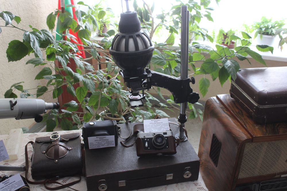На стеклянных стеллажах – патефон 1949 года выпуска с паспортом и ОТК, отмеченные Знаком качества проигрыватель «Вега» и транзистор «Беларусь-2», радиостанции с радиоточками, радиола с приемником и проигрывателем, датированная 1959-м годом, для запуска в работу которого только лампочку и конденсатор пришлось поменять. Есть тут и бинокль 1944 года, который побывал на реальной войне, и фотоаппарат «Смена» с фотопроявителем и фотовспышкой, а также телескоп, старый карманный фонарик и подлинный американский фонарь полицейского, печатная машинка, старинная настольная лампа, перья с чернилами.