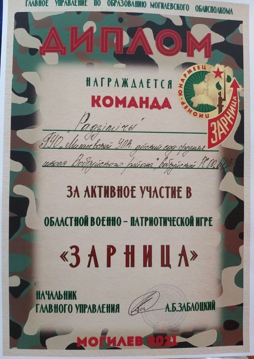 26 мая на базе ГУДО «Областной центр творчества» прошла областная военно-патриотическая игра «Зарница». Участие в состязании приняли около 240 школьников 13-14-ти лет со всего Приберезинского края в составе 24-х команд — победителей районных этапов игры. Честь Бобруйского района отстаивал отряд «Радзімічы» из Михалевского УПК «Детсад-СШ» под руководством капитана Дианы Тарасевич. Сопровождали ребят на игру председатель РОО «БРПО» Олеся Малюкова и учитель физической культуры и здоровья Василий Юшкевич.