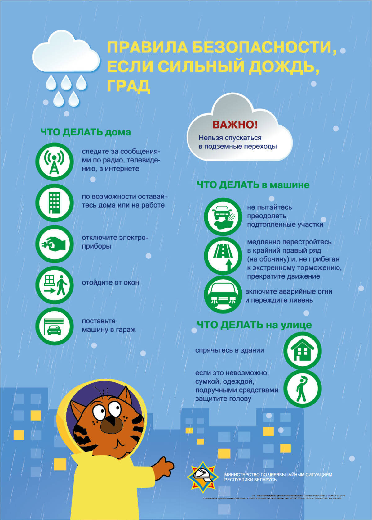 При граде защитите голову от ударов (прикройте голову руками, сумкой, одеждой). Не пытайтесь найти укрытие под деревьями.