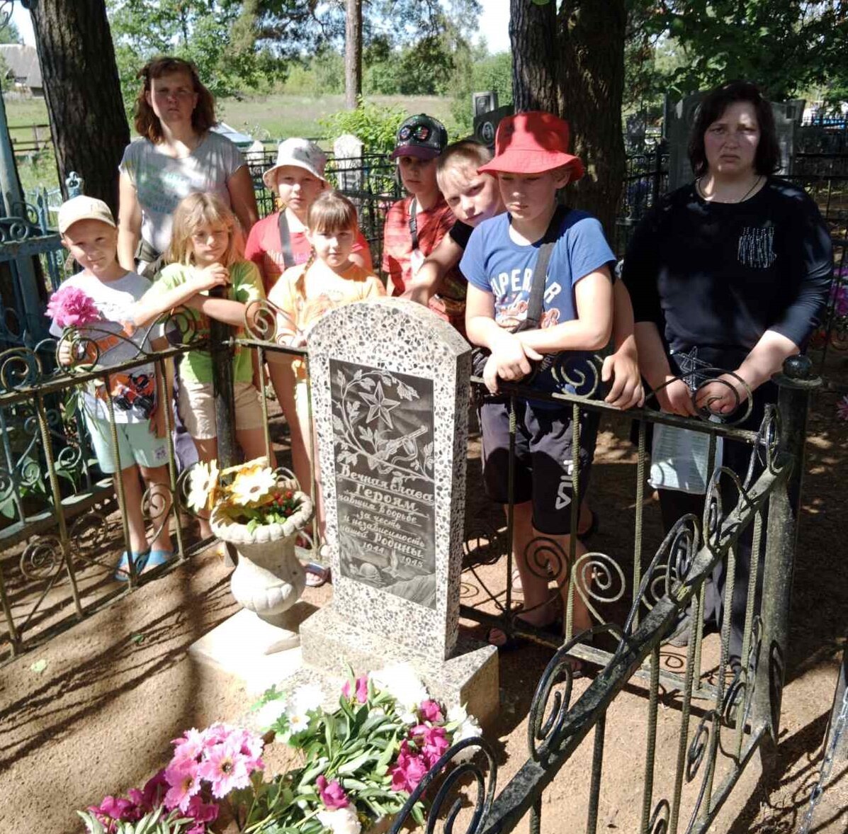 Проехав 1,5 км, участники прибыли на братское захоронение, где возложили к монументу погибших защитников Отечества живые цветы и почтили их память минутой молчания.