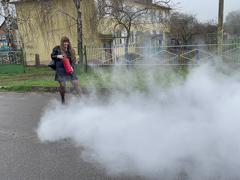После теории — к практике. Работники МЧС на улице показали, как можно потушить пламя порошковым огнетушителем, затратив при этом буквально несколько секунд времени.