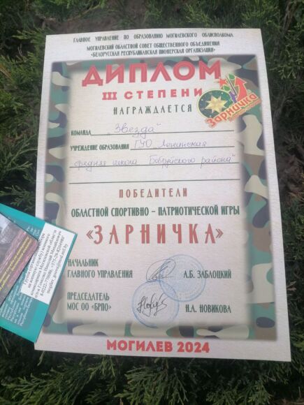 Атрад “Зорка” піянерскай дружыны імя М.Р. Пінчука Ленінскай сярэдняй школы, які прыняў удзел у мерапрыемстве, прадэманстраваў добрыя навыкі ў страявой падрыхтоўцы агляду строя і песні “Будзь гатовы!”, шырокія веды па гісторыі Вялікай Айчыннай вайны, піянерскага руху, па гісторыі дзяржаўных сімвалаў. У спартыўнай частцы гульні нашаму атраду не было роўных. “Дрыгву” і “Павуціну” акцябраты прайшлі першымі, без штрафных балаў.