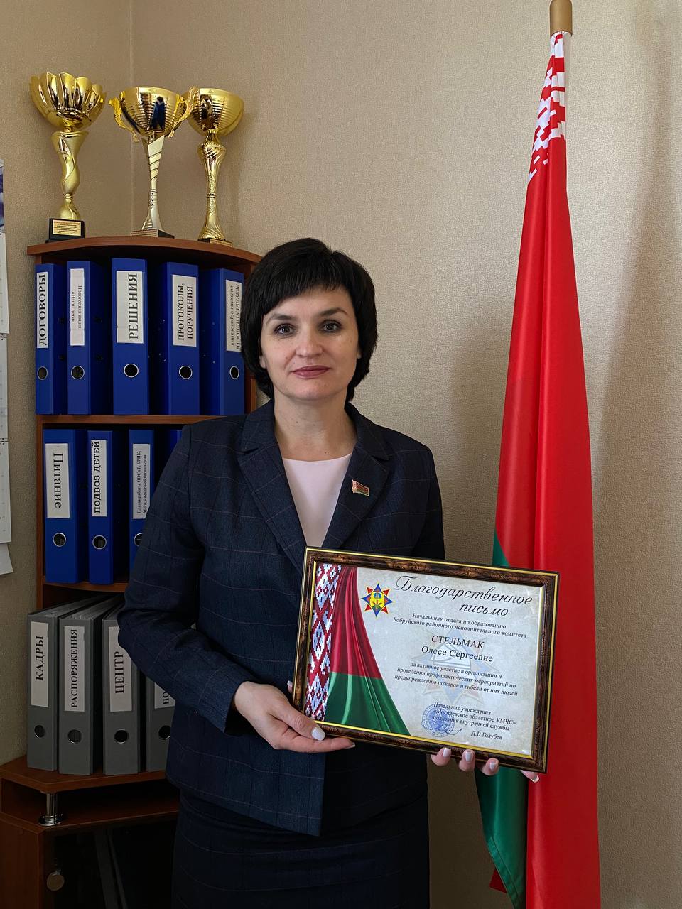 На заседании комиссии было вручено Благодарственное письмо начальнику отдела по образованию Бобруйского райисполкома Олесе Стельмак за активное участие в организации и проведении профилактических мероприятий по предупреждению пожаров и гибели от них людей от Могилевского областного УМЧС.
