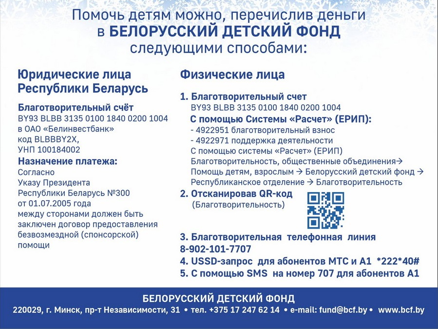 Благотворительная акции «Наши дети» проходит в нашей стране с 15 декабря 2025 г. по 14 января 2026 г. В рамках нее средства будут поступать на расчетные счета РОО «Белорусский детский фонд» и использоваться для ранней диагностики нарушений слуха у новорожденных детей и детей раннего возраста с помощью передового оборудования, которое будет приобретено и передано в ГУ «Республиканский научно-практический центр оториноларингологии».